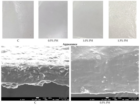 Appearance was evaluated visually in daylight. Photos were taken at a magnification of ×5. To study the morphological characteristics, scanning electron microscopy (SEM) was used to visualize the surface topography and cross section of the films. The films were coated with a thin layer of gold in a high-vacuum coating system (MSP-30T, Showa Shinku Devices Inc., Sagamihara, Japan), and were microscoped on a high-resolution transmission electron microscope with scanning transmission electron microscopy (STEM) function (Jeol JEM-2100, Tokyo, Japan) at magnifications of ×500 and ×1000.