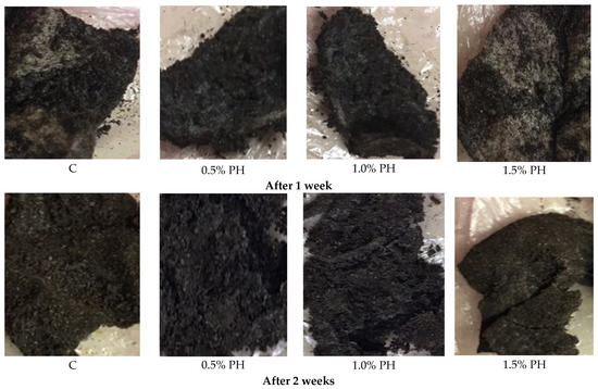 When assessing the degradability of polymeric materials derived from natural polymers, it was important to determine the time required for material degradation under exposure to the microorganisms and enzymes present in the environment. A film was considered biodegradable when 90% of its material has decomposed due to biological action within a period of up to six months [37]. The experiment showed that all samples of the films had a good degree of biodegradation, but strong connections between alginate particles and protein hydrolysate fragments prolonged the degradation time of film samples. After one week all film samples were shriveled and partially covered with mold. After 2 weeks, the control sample and the sample with 0.5% protein hydrolysate were completely decomposed into humus. Samples with the addition of 1.0 and 1.5% hydrolysate were completely decomposed in humus after three weeks. The natural polymers, which served as nutrient sources for soil microorganisms, degraded under the influence of a combination of factors such as moisture, oxygen deficiency, and temperature (Figure 3).