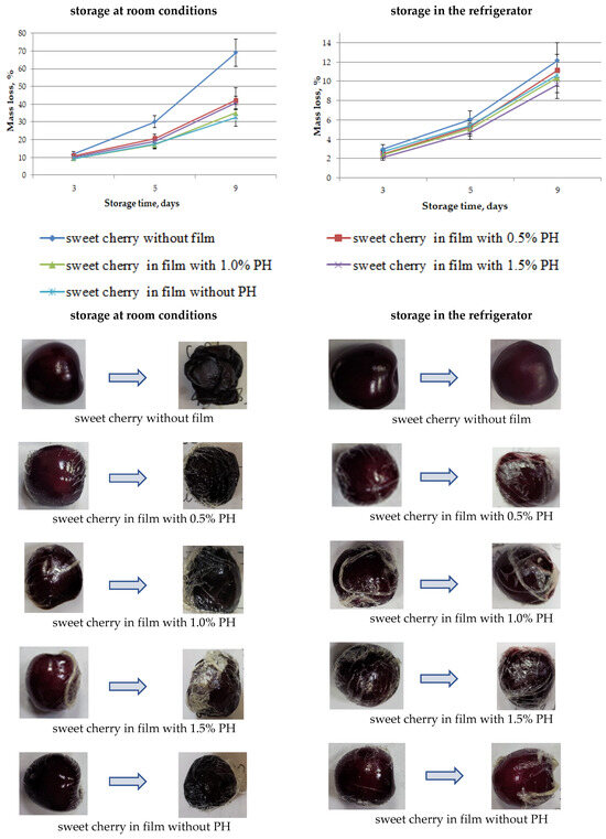 The results of studies of microbiological indicators showed that films with the addition of protein hydrolysate, either when stored in a refrigerator or when stored at room temperature, had an inhibitory effect on the growth of microorganisms and molds. More active growth of mold on the sweet cherries was observed when stored in the refrigerator (Table 3). The antimicrobial activity of PH is due to electrostatic interaction between bioactive peptides and cell membrane of microorganisms causing its disruption [23]. Similar results were obtained in microbiological studies of cherries coated with natamycin-chitosan. The authors found that when storing cherries in the coating, the number of aerobic mesophilic bacteria, yeasts, and molds, including pathogenic fungi that cause berry rotting, decreased [43].
