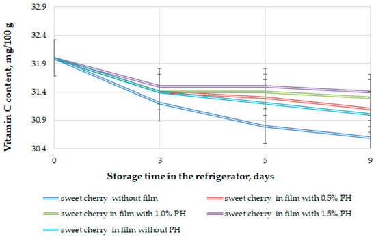 The skin on the sweet cherries is a natural barrier to moisture loss during storage. As shown by the results in Figure 5, weight loss of the sweet cherries without a film turned out to be higher both when stored in room conditions and in a refrigerator. In general, the weight loss of the berries was higher when stored in the room condition, which could be due to higher shrinkage. In appearance, the sweet cherry clearly showed a difference when stored in a packaged form, in contrast to berries without films. By the 5th day of storage in the room condition, the berries without a film began to dry out and deteriorate significantly, in contrast to the experimental samples of berries in films with PH, which remained visually fresh. Similar results were obtained by Zhang et al. (2022) when studying changes in the mass of cherry tomatoes packed in films with different structure formers [9]. The results of determining the vitamin C in the cherries stored in the refrigerator (Figure 6) showed that its losses differ slightly between test samples and do not depend on the amounts of protein hydrolysate introduced into the film, in contrast to the control sample. The loss of vitamin C during storage was due to its ability to quickly oxidize [42], so the amount of loss would depend on the gas permeability of film coatings and possibly the manifestation of the antioxidant effect by protein hydrolysate particles.