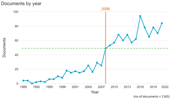 There were 1165 Scopus-indexed publications on revenue management in the tourism and hospitality industry published between 1989 and 2021. Figure 2 illustrates the annual publication trend in that period. It could be inferred that there is a difference between the number of annual publications before and after 2008. More specifically, during the pre-2008 period, annual publications were never higher than 30, while from 2008 onwards, the lowest number of annual publications was 49. In addition, annual publications of revenue management literature in the tourism and hospitality industry significantly increased between 2007 and 2008, and the figure nearly doubled from 25 to 49 publications within just one year.