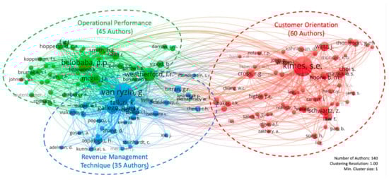 The authors’ co-citation analysis via VOSviewer [14] shows three schools of thought in the literature on revenue management in the tourism and hospitality industry, as shown in Figure 5. Schools of thought are classified by the topical focus of studies published by the authors in each cluster. The three schools of thought identified in this review are “Customer Orientation”, “Operational Performance”, and “Revenue Management Technique”.