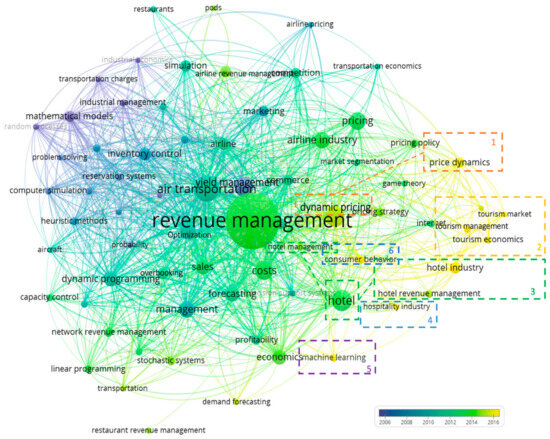 It is clear from the map that the literature on revenue management has shifted the focus from yield management, industry management, and reservation systems toward the concepts of price dynamics, consumer behaviors, and tourism markets. Furthermore, a trend could also be seen in how the schools of thought are formed. The literature started with the application of revenue management in airlines, which is mostly related to optimization on the organization side. It was heavily influenced by dynamic pricing model concepts. Later, the hospitality businesses adopted the concept of revenue management from airlines but shifted the focus toward the customer side. Hence, both the author co-citation map in Figure 5 and the temporal co-word map in Figure 6 display the same result of a closer relationship between the revenue management technique and operational performance school of thought, while the customer orientation school of thought is independent.