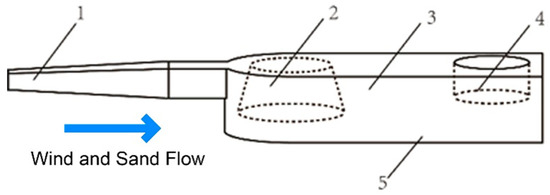 The design of the wind–sand separator is based on the principles of diversion and cyclic frictional energy loss, with the aim of effectively achieving the separation of gas and solid particles by reducing the flow velocity of the wind–sand mixture. Through structural modifications, the flow of air within the separator is altered, leading to energy losses due to frictional resistance and localized obstruction, consequently resulting in a reduction in the flow velocity of the air.