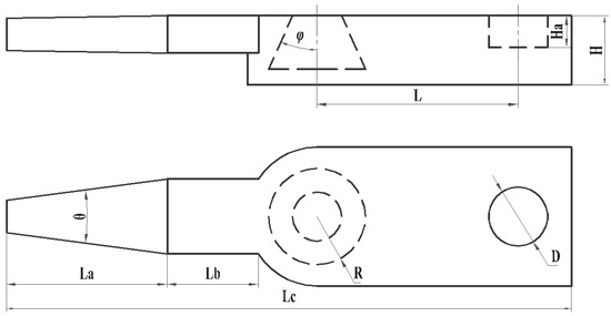 - Setting the inlet pipe’s expansion angle (θ) at 15° (Figure 8) increased the boundary layer thickness, significantly reducing the mainstream airflow velocity (from 13.8 m s−1 to 5.66 m s−1). The expansion section’s length (La) was established at 60 mm, and the horizontal channel’s length (Lb) was fixed at 35 mm (Figure 9). These measures were taken to prevent the blockage of the inlet airflow by the sand collector’s shell and to ensure isodynamic requirements.