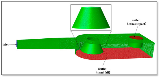 The choice of boundary conditions plays a pivotal role in elucidating the physical and operational characteristics of the topological structural entities representing the model’s boundaries in the geometric model. In consideration of the sand separator’s operational context within a free-flow wind field, the following boundary conditions are adopted: the air inlet employs a free-flow velocity inlet (VELOCITY_INLET); there exists a distinct gap between the sand drop port and the sand collection box of the sand separator, leading to the utilization of two free-flow outlets (sand drop port and exhaust port), designated as free-flow outlet boundary types (OUTFLOW); and to ensure internal flow state consistency within the separator, symmetry surfaces (SYMMETRY) are assigned to the top and side boundaries of the separator.