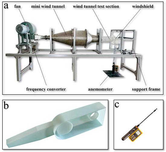 Experimental layout: (a) micro wind tunnel layout, (b) wind–sand separator model, and (c) Fluke 923 hot-wire anemometer.
