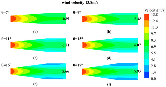 Figure 8. XY cross-section wind speed cloud at the center of the intake pipe: (a) θ = 7°, (b) θ = 9°, (c) θ = 11°, (d) θ = 13°, (e) θ = 15°, and (f) θ = 17°.