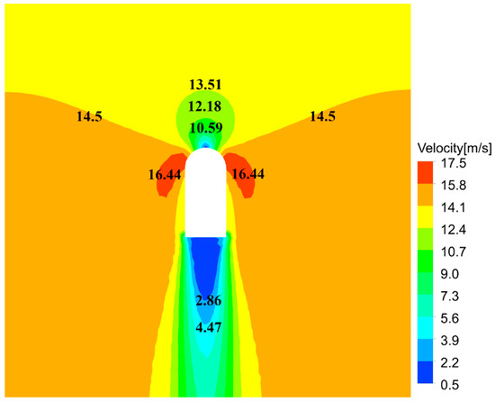 presents the wind speed data for both the exhaust port and the sandfall area at five different wind speeds, with the highest recorded wind speed being 1.44 m s−1 at the exhaust port and 1.40 m s−1 at the sandfall area under strong wind conditions (13.8 m s−1). When these data are applied to Equation (15), it is observed that the wind speeds at the exhaust port decreased by as much as 89.56%, while at the sandfall area, they decreased by up to 89.85%. The recorded wind speeds at the sandfall area ranged from 0 to 1.48 m s−1, which aligns with the results obtained through the simulation.