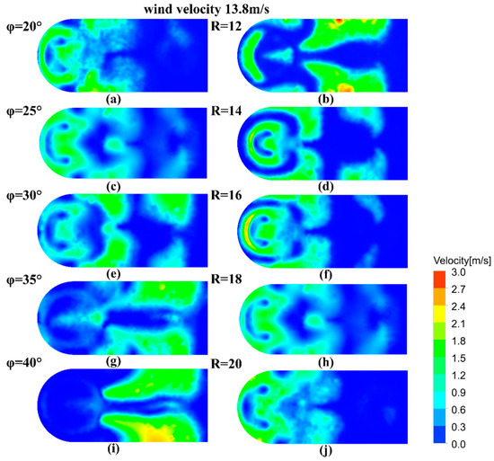 The numerical simulation results presented in Figure 10 highlight the substantial influence of the cone angle (φ) and radius (R) of the truncated cone’s bottom surface on the airflow behavior. Firstly, in regard to the cone angle (φ), when φ was less than or equal to 20°, the decomposition effect on the airflow velocity along the axial direction was not particularly noticeable. This resulted in a more pronounced impact on the airflow’s bottom velocity component at the end of the slanting column. Conversely, when φ was greater than or equal to 30°, the airflow failed to pass through the truncated cone with a sufficient impact to effectively slow down its velocity. Instead, a significant portion of the airflow passed through the walls on both sides of the double column, leading to the creation of a high-speed vortex region following collision with the wall. This phenomenon notably affected the region surrounding the sandfall opening and sand drop area.