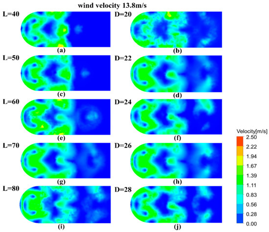 Figure 11. Numerical simulation of wind speed cloud at the sandfall port of the sand separator when adjusting the structural parameters of the exhaust pipe.