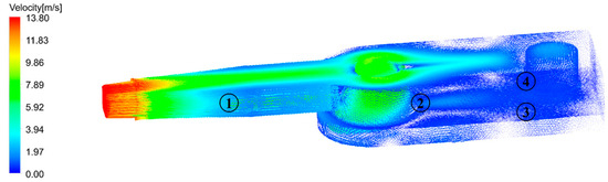 After the sand flow entered the air inlet, the first reduction in speed was achieved through the local expansion of the air inlet (Figure 12). Subsequently, the airflow impacted the diverter slanting column through the gas–solid separation cavity, causing a change in flow direction and resulting in the second speed reduction through the energy consumption induced by the local resistance. The airflow then bifurcated along the wall, bypassing the flow, and underwent collision at the end before merging into the main stream, leading to the third speed reduction through collision with the exhaust pipe wall. Additionally, a portion of the airflow formed a vortex flow, moving along the wall and colliding with it, thereby achieving the fourth speed reduction through the loss caused by the frictional resistance. Moreover, the space between the manifold column and exhaust pipe generated multiple cycles of impact and friction, resulting in a loss of airflow energy and achieving a further speed reduction.