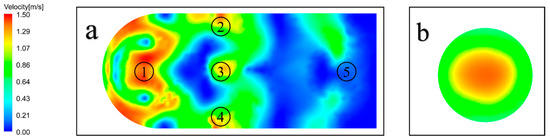 Referring to Figure 13, the velocity cloud at the sandfall outlet (Figure 13a) clearly demonstrated significant variations in the airflow velocity across different locations within the sandfall outlet region following the velocity reduction by the wind–sand separator. In areas 1, 2, 3, and 4 of the sand outlet, the wind velocities ranged between 0.69 to 1.48 m s−1. Meanwhile, in the remaining sections of this region and in area 5, the wind speeds ranged from 0 to 0.69 m s−1.