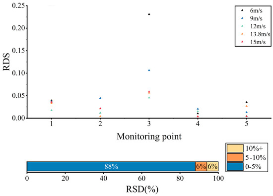 To better analyze the discrepancy between the simulation results and wind tunnel test results, the relative standard deviation (RSD) is employed as an evaluation index to assess the degree of dispersion of the wind speed data obtained from the numerical simulation and the wind tunnel test. The relative standard deviation is calculated as the ratio of the standard deviation of the data set to its arithmetic mean, serving as a measure of the accuracy of the test results. It is considered that the data fit well when the value of the relative standard deviation of the wind speed was in the range of 0–5% [24]. The calculation formula for the relative standard deviation is as follows: