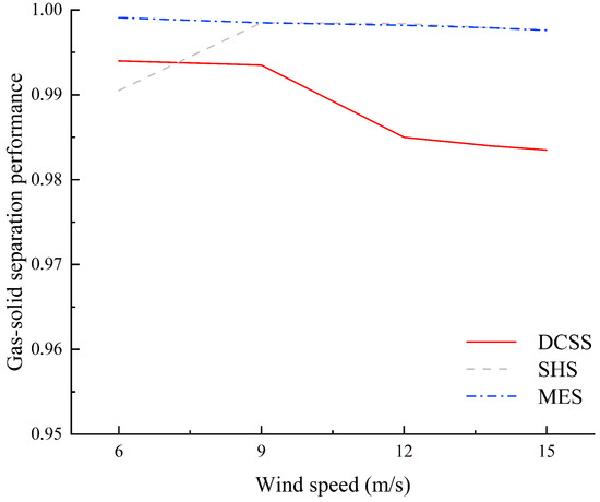 Figure 16 provides insights into the wind–sand separation performance. Notably, at lower wind speeds, the performance of the SHS was relatively insensitive. However, at other wind speeds, it closely matched the performance of the multistage expanded combined wind–sand separator. While the wind–sand separation efficiency of the DCSS might be comparatively lower, it remained above 98.6% across all the tested wind speeds. An additional advantage of the DCSS is its slight superiority in velocity reduction performance. Even more advantageous is the fact that the DCSS can be installed vertically within the sand collector. This feature enhances its portability, reduces its susceptibility to wind and sand mobility, and renders it suitable for open field experiments.