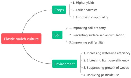 Plastic film mulching cultivation has the functions of increasing temperature, water retention, and improving the utilization rate of light, which is a technical measure that can significantly achieve crop yield increase. The main reasons why plastic film mulching cultivation is widely used in China are: (1) China has a large population and a high demand for grain and agricultural products. But the per capita arable land is limited, and there is an urgent need to increase crop yields. Practice has shown that plastic film mulching cultivation can increase crop yield by 30–50% [119,120,121]. (2) Many arable lands in China have extremely poor soil and relatively poor climate conditions. And plastic film mulching cultivation can effectively improve these natural conditions, ensure, and promote the healthy production of crops [67,122].