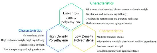 The plastic mulch currently used in agriculture is polyethylene blow. There are three main types of polymers used to make plastic films: low-density polyethylene (LDPE), high-density polyethylene (HDPE), and linear low-density polyethylene (LLDPE). There are significant differences in their molecular structure, material properties, processing characteristics, and product performance [48,49,50]. As shown in Figure 2, different types of polymers are made into plastic mulch.