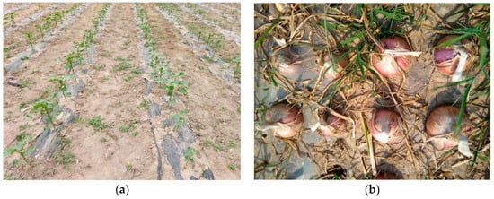 Typical crops are covered with plastic mulch for planting. (a) Cotton covered by plastic mulch; (b) onion covered by plastic mulch.
