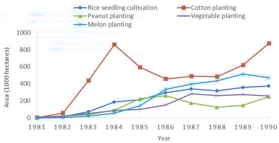 At that time, plastic film covering was mainly used for rice seedling cultivation and cultivation of cotton, peanuts, vegetables, and melons (Citrullus lanatus). Figure 5 shows the changes in the area covered by plastic film for various crops between 1981 and 1990. From Figure 5, it can be seen that the area covered by plastic film for rice seedling cultivation, vegetables, and melons was basically increasing year by year. Peanuts showed a trend of increasing first, then decreasing, and then increasing again. Cotton underwent significant changes. In 1984, it suddenly increased to 0.86 million ha and then decreased year by year. It began to increase in 1988 and exceeded 0.87 million ha in 1990.
