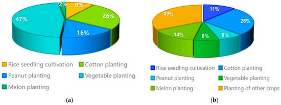 Proportion of cultivation area covered with plastic mulch for different crops in 1981 and 1990. (a) 1981; (b) 1990. Note: The data were sourced from the China Rural Statistical Yearbook and post-processing calculation.
