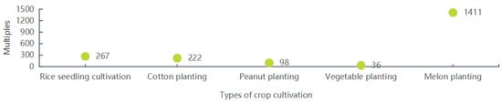 The proportion of plastic film coverage of major crops in China in 1981 and 1990 is shown in Figure 6. Compared to 1981, the proportion of rice seedling cultivation increased by 2% in 1990. Cotton remained unchanged at around a quarter of the total. Peanuts were reduced by half; vegetables decreased from 47% to 8%. Melons increased by 12%. Although the proportion of plastic film coverage on various crops increased and decreased, the area in 1990 increased compared to 1981. Figure 7 shows the multiple increases in the area covered by plastic film for various crops. Among them, the increase in melons was the most significant, 1411 times higher in 1990 than in 1981.