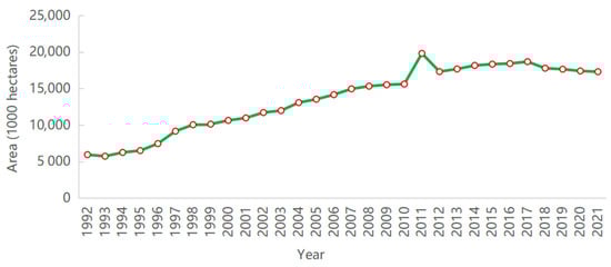 The area covered by plastic mulch in China from 1992 to 2021. Note: The data were sourced from the China Rural Statistical Yearbook.