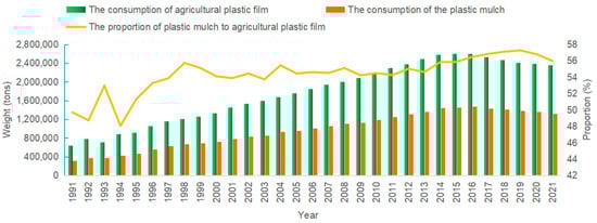 The consumption of agricultural plastic mulch in China from 1991 to 2021. Note: The data were sourced from the China Rural Statistical Yearbook and post-processing calculation.