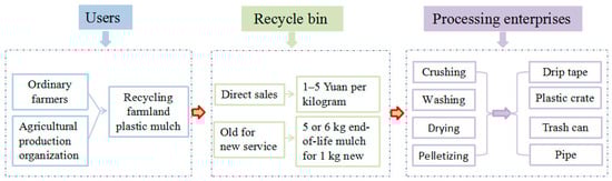 In 2017, the Ministry of Agriculture and Rural Affairs of China implemented the action of recycling farmland plastic mulch, laying the foundation for the recycling and utilization of waste plastic mulch resources. Subsequently, multiple regions across the country carried out plastic mulch pollution control projects and achieved significant results. A preliminary relationship system has been established between producers, sellers, users, and recyclers of agricultural plastic mulch. As shown in Figure 13, a technical solution for the recycling and reuse of farmland plastic mulch has been explored and formed under government regulation and market promotion.