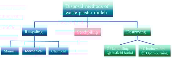 In fact, waste plastic mulch is a resource of agricultural solid waste. Their residues in farmland soil can easily cause soil and environmental pollution and can also affect crop growth and agricultural machinery operations. How to achieve the recycling and utilization of waste plastic mulch is another important solution to solve the problem of plastic pollution in farmland [109,110]. To this end, the Chinese government, researchers, and farmers have conducted much exploration and testing.