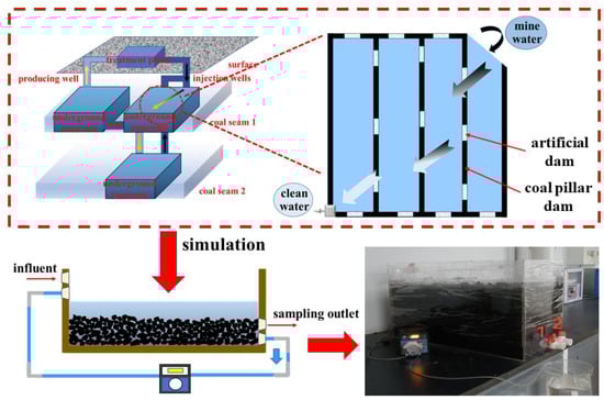 In regions of China abundant in coal resources, water scarcity poses a challenge due to the substantial water requirements of coal mining operations. Consequently, the conservation and efficient utilization of water resources are intricately linked to ensuring sustainable coal extraction practices. In view of the arid climate prevalent in the western mining areas of China, significant quantities of mine water are currently being wasted through evaporation. Scholars have proposed the concept of “coal mine underground reservoir (CMUR)” which utilizes underground goaf for the purification, storage, and utilization of mine water [1,2]. This approach transforms the protection of mine water from a “plugging method” to a “guide storage” [3]. It has been observed that the CMUR can effectively reduce the total hardness, suspended matter, and pollutant concentration in the mine water [4]. The purified mine water obtained through CMUR can be utilized for various purposes including underground water supply [5], thereby achieving the recycling of mine water and effectively addressing issues related to mine water waste and evaporation. Taking the CMUR of Daliuta as an example, the inlet and outlet water samples were detected [6]. The concentrations of Ca2+ and