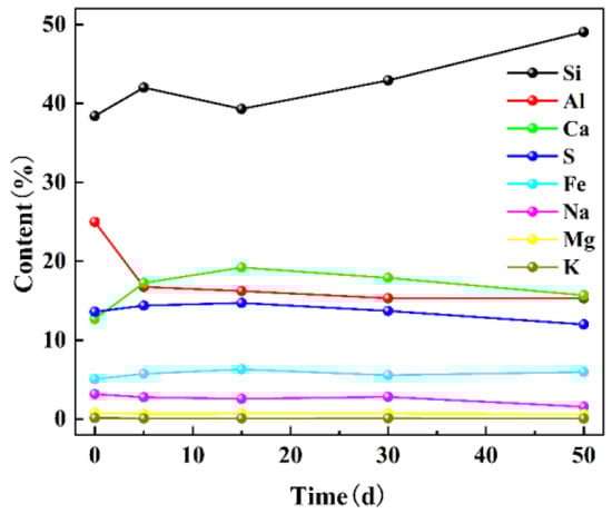 The elemental composition of coal samples was determined using XRF on days 0, 5, 15, 30, and 50 to analyze the changes in mineral element content during the water–coal interaction (Figure 2). Si and Al were found to be the most abundant elements in coal, followed by S, Ca, Fe, Na, Mg, and K. After the dynamic simulation experiment, the mass fractions of Si and Ca in coal increased from 38.20% and 12.67% to 49.05% and 15.70%, respectively. Conversely, the mass fractions of Al and Na decreased from 24.98% and 3.17% to 15.29% and 1.56%, respectively, while other elements showed minimal changes. It was determined that these elements typically occurred in the form of minerals listed in Table 1 within coal [18,19].