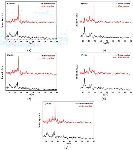 XRD patterns of coal samples before and after reaction: (a) kaolinite, (b) quartz, (c) calcite, (d) pyrite, (e) gypsum.
