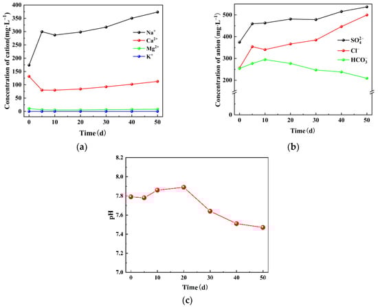 The concentrations of anions and cations in the water samples were measured on the days 0, 5, 10, 20, 30, 40, and 50. Additionally, the pH variations in the mine water during the experiment were monitored, as shown in Figure 4. The cation concentration was Na+ > Ca2+ > Mg2+ > K+, with initial concentrations of 173.9 mg/L, 131.8 mg/L, 10.8 mg/L, and 0.1 mg/L, respectively. As the experiment progressed, the concentration of Na+ gradually increased and reached a final concentration of 373.5 mg/L. The concentration of Ca2+ initially decreased to 79.9 mg/L and then slowly increased to 112.8 mg/L. The concentrations of Mg2+ and K+ fluctuated within the ranges of 5.3–10.8 mg/L and 0.1–0.12 mg/L, respectively. The concentration of anions in the mine water was ranked as > Cl− >
