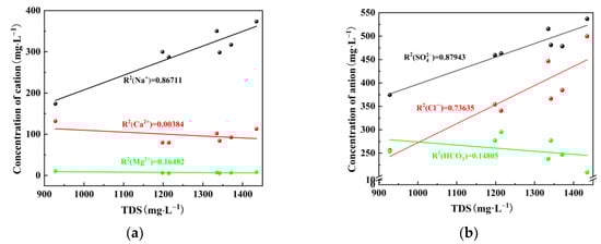 Total dissolved solids (TDS) are a comprehensive reflection of the concentration of major ions in water [20]. TDS typically undergo changes due to various factors, such as mineral dissolution in coal. Through the relationship between the main anions and cations in water and TDS, the source of the main ions in mine water can be speculated, which provided a theoretical foundation for subsequent analysis of interaction [21]. In Figure 5a, with the increase of TDS, the concentration of Na+ exhibited an increase, while the concentration of Ca2+ showed a slight decrease and the concentration of Mg2+ remained relatively stable. Notably, a strong linear correlation was observed between Na+ and TDS with a coefficient of R2 value of 0.86711. In Figure 5b, with the increase of TDS, there was a decline in concentrations of and