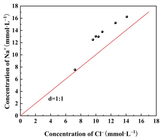 During the experiment, prolonged contact between mine water and coal resulted in alterations to the element content and mineral composition of coal, as well as variations in the concentrations of anions and cations in mine water. Notably, there was a pronounced observed change in Na+ concentration in the mine water. Sodium chloride is a predominant form of Na in coal. If Na+ and Cl− solely originated from the dissolution of sodium salt NaCl under the influence of water–coal interactions, the concentration ratio of Na+ and Cl− should be close to 1 [22,23]. However, the Na+/Cl− concentration ratio for all water samples in the dynamic simulation experiment exceeded the straight line 1 (Figure 6), indicating an excess of Na+ relative to Cl−. This suggested that other sodium-containing minerals in coal also dissolve besides sodium chloride. The content and proportion of water-soluble (inorganic salt form), acid-soluble (organic form), and insoluble (mineral form) materials can be obtained by conducting step-by-step extraction experiments on alkali metals in coal with extractants, such as H2O, NH4Ac, and HCl [24,25].