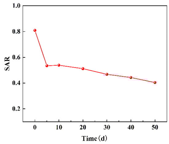 In the water–mineral interaction system, alterations in the composition of water led to the replacement of specific ions attached to the mineral surface by exchangeable ions in water [31,32]. The reaction between Ca2+ and Mg2+ in mine water and Na+ in rock can be represented by Equations (3) and (4) [33]. Hence, sodium adsorption ratio (SAR) was employed to assess whether cation exchange occurred between Ca2+ and Mg2+ in the mine water and Na+ in coal, as well as to determine the strength of such reaction. The temporal variation of SAR value was calculated according to SAR value [34], as shown in Figure 7. The SAR value decreased with time, while the cation exchange strength increased. The SAR value exhibited a rapid decline within 5 days, followed by a gradual decrease, indicating a higher rate of the ion exchange reaction in the early stage and a slower rate in the later stage. In the presence of the water–coal interaction, Ca2+ and Mg2+ in water can exchange ion with Na+ in coal, leading to an increase in Na+ concentration in water and a decrease in Ca2+ and Mg2+ concentrations.