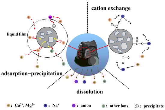 In summary, Na+ in mine water originated from the dissolution and cation exchange of water-soluble sodium (e.g., NaCl) in coal, with the dissolution being more significant than cation exchange. The decrease of Ca2+ concentration was a result of multiple factors, including the dissolution of gypsum and other minerals in coal, as well as the adsorption and precipitation reactions involving Ca2+ by coal and cation exchange. Although the cation exchange reaction led to a reduction in the concentration of Ca2+ in the mine water, its reaction intensity was relatively weak. Therefore, the adsorption and precipitation of Ca2+ by coal played a dominant role in the process of reducing Ca2+ concentration. In addition to the dissolution of gypsum and the oxidation of pyrite, the source of may also originate from the dissolution of water-soluble sodium (e.g., Na2SO4). The content of pyrite remained relatively stable, indicating that the main source of was likely from the dissolution of gypsum and other minerals. By analyzing the changes of inorganic components in coal and the concentration of anions and cations in the mine water under the water–coal interactions, the mechanism of water–coal interactions can be known, as shown in Figure 8, which can be summarized as the dissolution of minerals in coal by mine water, followed by the adsorption and precipitation of ions onto coal minerals and the cation exchange between coal and water.