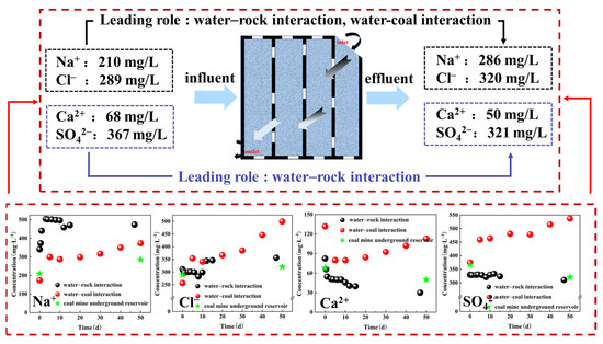 and Ca2+ concentration in the effluent of reservoir. The decrease of Ca2+ concentration was predominantly attributed to rock-mediated adsorption and precipitation processes. Conversely, the dissolution of minerals in the water–rock and water–coal interactions served as the primary mechanism driving an increase in Na+ and Cl− concentration in water.