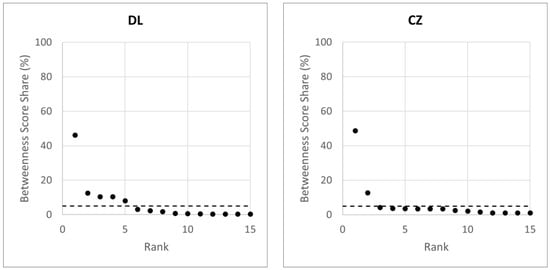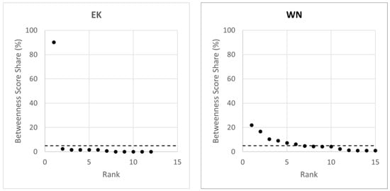 Distributions of betweenness score percentages of four air carriers (EK: Emirates, WN: Southwest, DL: Delta, CZ: China Southern, dotted-line indicates 5% of betweenness score).