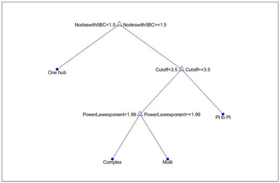 A classification tree, allowing the cases to be broken into systematic categories, is shown in Figure 3. There are four classification types, determined by exploring the networks and defining their characteristic features. There are three elements to the classification rules: (1) how many nodes have a large proportion of betweenness; (2) what the cut-off is; and (3) what the power-law parameter is. A power-law analysis is useful here—especially with the endogenous selection of a cut-off (i.e., an indication of the range of values where the power law holds). Curve fitting software that endogenously determines the cut-off allows us to find the range of values over which a power law fits—it is shown that cases with a large cutoff value tend to be point-to-point networks.