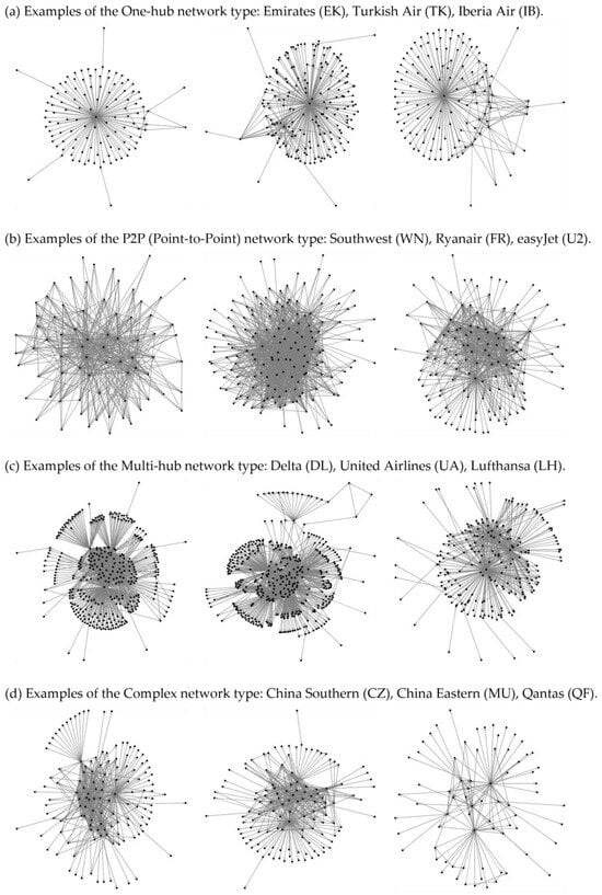 From these results, Figure 4 represents three exemplary networks for each of the four groups, respectively (see Figure 4a–d). There is a stark organizational contrast between those at the top of the table (e.g., Emirates) and those at the bottom (e.g., Ryanair).
