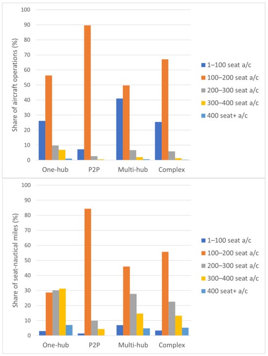 Proportions of aircraft operations (upper) and seat-nautical miles (lower) by aircraft sizes (0–100, 100–200, 200–300, 300–400, greater than 400 seats) and network types (One-hub, P2P, Multi-hub, Complex).