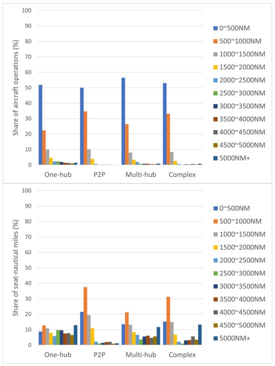 Proportions of aircraft operations (upper) and seat-nautical miles (lower) in terms of distance ranges and network types (One-hub, P2P, Multi-hub, Complex).