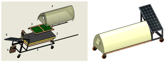 Assembly drawing of the solar tunnel dryer. Where: (1)—steel structure, (2)—tunnel floor, (3)—drying tray, (4)—reticular structure and plastic cover, (5)—control box, and (6)—solar panel.