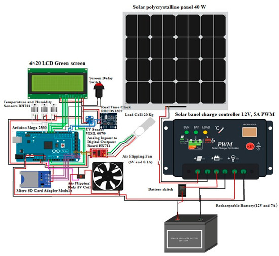The solar tunnel drying is provided with a system for measuring, recording, and maintaining temperature and humidity as shown in Figure 2 on the right. A polycrystalline solar panel produces the required voltage in the morning when it is exposed to sunlight, producing a power of 40 watts with an average voltage of 18 V, which is then used to charge an acid battery at a rate of 12 V and 7 A. The code that is tied to the processor memory instructs the processor to read the data output from the sensors, store them, and then send them to the screen for display at certain periods for each sensor. This is how the Arduino Mega 2560 (Monza, Italy) board functions. The Tiny RTC DS1307 (Real Time Clock, Shanghai, China) board keeps the time and date to ensure that the values and readings are recorded together for accuracy, and restarting the Arduino board will reset the time and date. Three temperature and humidity sensors DHT22 collect humidity and temperature distributed inside and outside the tunnel to see the extent of the impact of insulation of the plastic tunnel and the amount of heat transferred, which are high-accuracy sensors. The VEML 6070 UV (Munich, Germany) light sensor works to measure the level of ultraviolet rays, specifically from the sun’s total radiation, because it increases damage to the product to be dried. The reading is displayed on the screen at an update and permutation rate of 0.25 s. The load cell sensor installed in the center of the tunnel floor measures the weight of the drying tray (known as “2350 g”) in addition to the product’s weight spread within the tray every 10 min. The air-agitating fan inside the tunnel works to expel the moisture-laden air and replace it with fresh air, so as not to damage the product to be dried by relay, for only one minute to prevent all heat from leaking out. Every 10 min, with a micro SD card adapter, the current reading is taken from all sensors and recorded on the memory card with the time and date, which facilitates the process of follow-up.