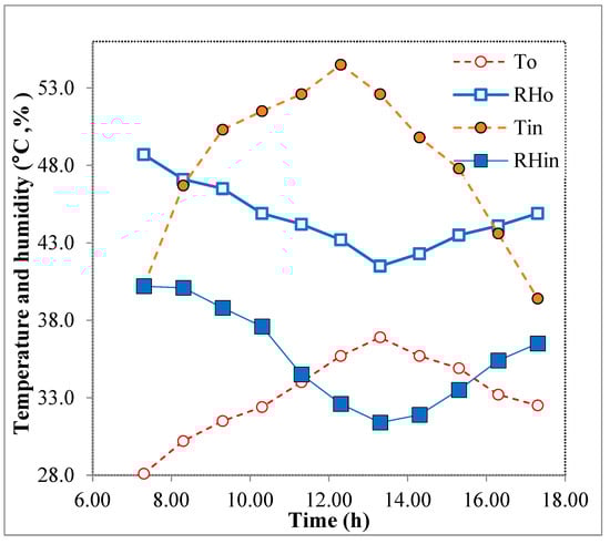 Variations in the tunnel dryer’s outside and inside air temperature and relative humidity during the experiments are shown in Figure 3. During the drying experiment, the daily mean values in and out of the tunnel of air temperature and relative humidity variations are from 39.4 to 54.5 °C, 28.1 to 36.9 °C, and 31.6 to 40.2%, 41.5 to 48.7%, respectively. The ambient air temperature in and out of the TD reached the maximum between 11:00 and 14:00. This was when the relative humidity was at its lowest levels. It was found that the drying temperature in TD was higher than the outside temperature. In contrast, the TD relative humidity was lower than the outside relative humidity. There were significant differences between the values of the temperature and relative humidity. During the experimental time, these values were about 11.3 to 17.6 °C and 8.5 to 9.9%. This indicates that the rate of drying in TD will be higher than SD.