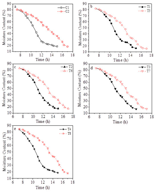 Variations in moisture % over time during a typical experimental run during the solar drying of banana slices. (a) C1: control tunnel and C2: control sun, (b) T1: sucrose tunnel and T5: sucrose sun, (c) T2: sodium bisulphate tunnel and T6: sodium bisulphate sun, (d) T3: ascorbic + citric tunnel and T7: ascorbic + citric sun, (e) T4: lemon juice + acetic tunnel and T8: lemon juice + acetic sun.