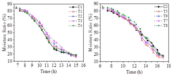 Moisture ratio vs. time (h) curves. (a) C1: control tunnel, T1: sucrose tunnel, T2: sodium bisulphate tunnel, T3: ascorbic and citric tunnel, T4: lemon juice and acetic tunnel, (b) C2: control sun, T5: sucrose sun, and T6: sodium bisulphate sun, and T7: ascorbic and citric sun, and T8: lemon juice and acetic sun.