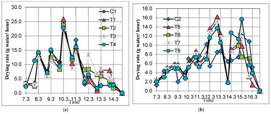 Drying rate (g water/h) over time (h) curves. (a) C1: control tunnel, T1: sucrose tunnel, T2: sodium bisulphate tunnel, T3: ascorbic and citric tunnel, T4: lemon juice and acetic tunnel, (b) C2: control sun, T5: sucrose sun, and T6: sodium bisulphate sun, and T7: ascorbic and citric sun, and T8: lemon juice and acetic sun.