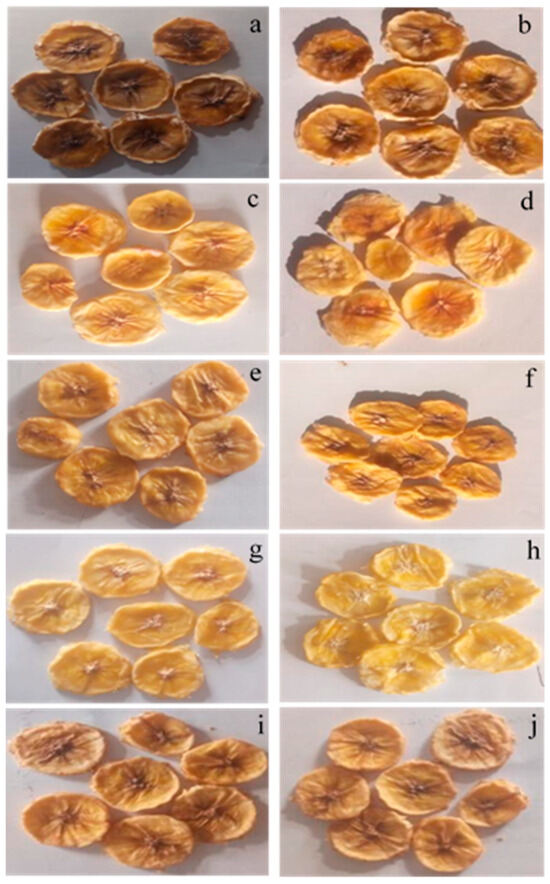 The variation in pretreatment techniques and drying conditions could all be contributing factors to the observed color variation in dried bananas in this study. Boudhrioua et al. [62] found that blanching and sodium pyrophosphate pretreatments can help avoid the browning of raw and ripe bananas dried at 60 °C air temperature. In a different investigation, Ranken et al. [63] employed a 1:1 ascorbic-citric acid solution as a chemical treatment to stop dry bananas cooked to temperatures between 40 and 70 °C from turning discolored.